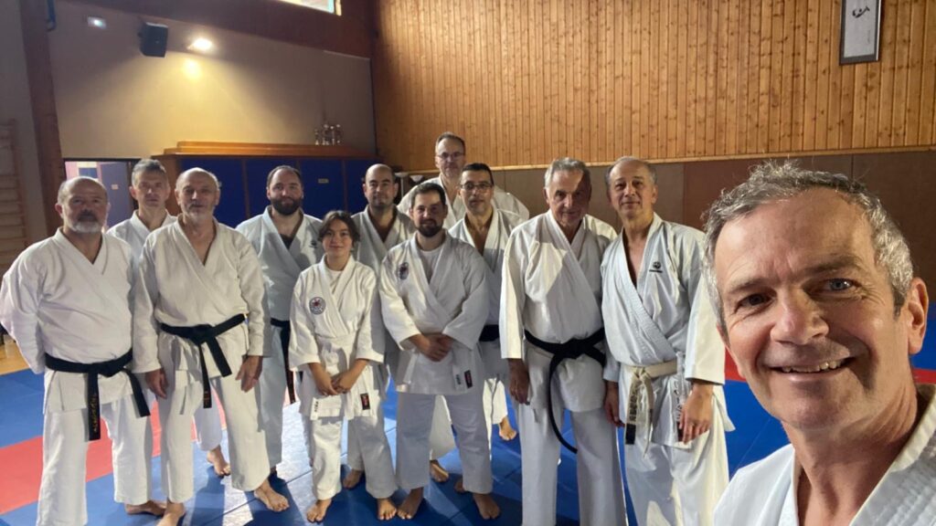 Le dimanche 19 octobre, s’est tenu le deuxième stage de la saison, et le succès a été au rendez-vous !Douze pratiquants motivés se sont retrouvés pour une matinée entièrement dédiée aux Katas, animée par Henri, qui a su une fois de plus transmettre son exigence technique et sa passion. Au programme : trois katas emblématiques du style Shotokan — Heian Godan, Bassai Dai et Jité —, étudiés en détail, avec un accent particulier sur la précision du geste, le rythme et l’intention. Chaque kata a permis d’explorer un niveau d’exigence différent, offrant à chacun l’opportunité de progresser selon son grade : 🥇 Heian Godan, dernier de la série des Heian, est un kata de 1er kyu alliant fluidité, stabilité et coordination. Il prépare à la complexité des katas avancés grâce à ses changements de niveau et son fameux saut final. 🛡️ Bassai Dai, véritable classique du karaté d’Okinawa, signifie “pénétrer la forteresse”. Étudié à partir du 1er kyu et envisageable pour le 2ème dan, il développe la puissance, la détermination et la gestion de l’énergie interne (kime). ⚖️ Enfin, Jité, kata de 3e dan, a clôturé la séance sur une note plus technique encore. Ses postures enracinées, ses mouvements de levée caractéristiques et son rythme maîtrisé demandent une grande maturité martiale et une parfaite stabilité. Tout au long du stage, Henri a pris le temps de proposer des conseils personnalisés, ajustant postures, respirations et enchaînements pour permettre à chacun d’affiner sa pratique. L’approche, à la fois rigoureuse et bienveillante, a permis à tous de progresser dans un esprit d’écoute et de partage. La matinée s’est conclue par un pot convivial, prolongeant dans la bonne humeur cette séance aussi technique qu’enrichissante.Un grand merci à Henri pour son investissement et sa pédagogie, ainsi qu’à l’ensemble des participants pour leur énergie et leur engagement. Rendez-vous au prochain stage pour continuer sur cette belle dynamique d’apprentissage et de convivialité ! 👊